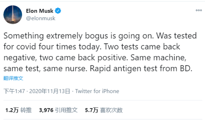 马斯克在推文中表示,“同样的机器,同样的测试,同一个护士”,但结果“看起来很假”。随后,马斯克还表示有感冒症状,已经在其它实验室再次检测,将在24小时内出结果。