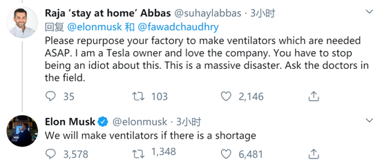 今年3月,马斯克曾在推特上表示,“对新冠病毒感到恐慌是很愚蠢的”,遭到了部分网友的猛烈抨击。同月,当有特斯拉车主在推特上建议马斯克生产呼吸机时,马斯克回应称,“如果有短缺,我们将会生产”。