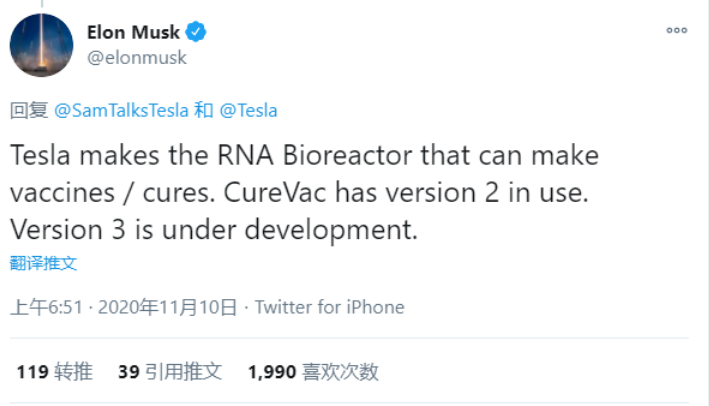 7月1日,马斯克在推特上表示,该公司将生产移动分子打印机,从而帮助德国企业CureVac研发对抗COVID-19病毒的疫苗。就在前几日,马斯克在推特上称,特斯拉建立的RNA生物反应器(RNA Bioreactor)可以制造疫苗及生产药物,目前CureVac正在使用第二代,第三代正在研发中。有趣的是,在今年9月份,马斯克曾表示,即使有疫苗上市,他将来也不会接种。