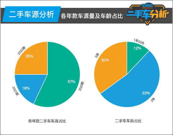 从各年款二手车车源占比和车龄占比来看,2020款车型占比最高,已超五成。而2021款和2020款车型占比相对较少。在二手车车龄占比方面,2年车龄的车型占比最高,达53%。其次是3年车龄的车型,也超过了30%,而一年以内车龄的车型占比最少。