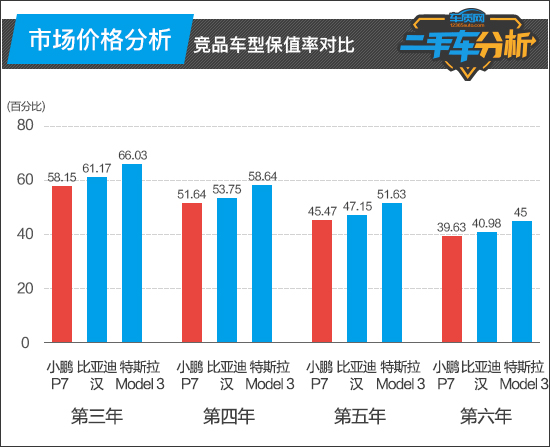 对于购买二手车的消费者而言,车辆保值率的高低也是影响购买决策的一个重要指标。一般来说,保值率越高的车型,意味着二手车价格也相对要更为坚挺。小鹏P7前6年的保值率均低于两款竞品车型,但第三年的保值率仍接近60%,在纯电动车型保值率排行榜中位居第11位。