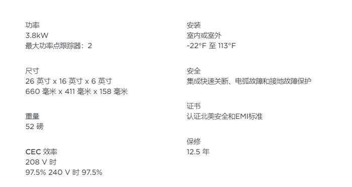 特斯拉的太阳能光伏系统采用的是长45''、宽15'' 的“太阳能屋顶”,防火等级A级,可借助太阳能逆变器,充当3.8kw和7.6kw两种不同功率的电源。