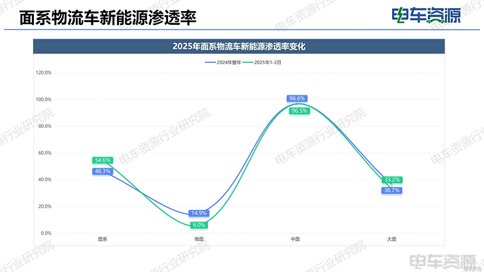 中面:两年渗透率均处于极高水平,2024 年为 96.6%,2025 年 1-2 月为 96.5%,几乎持平,说明中面物流车已高度普及新能源车型。