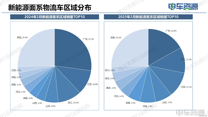 广东、浙江、江苏等经济发达地区是新能源面系物流车的主要市场。2025 年 2 月,广东新能源面系车销量领先,但不同车型在各地区的表现差异很大。比如新能源微面,广东销量 65,去年同期 288,降幅达 77.4%,占有率也下降了 4.6%;而江苏、浙江等地虽销量也有波动,但安徽销量增长明显,增幅达 39.3%,占有率提升 7.3%。中面和大面在各地区同样有不同表现,像中面在河南、四川等地销量增长迅猛,河南增幅 722.4%,四川增幅 720.5% 。这说明不同地区的市场需求、政策环境对新能源面系车的销量影响巨大。