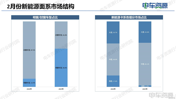 从车型分类来看,明窗车型在25年2月份占比同比大幅提升,从 2024 年的2月份 12.5% 升至58.4%,封窗车型占比相应下降。这或许和市场需求变化有关,明窗车型在一些特定场景,像城市配送、客货两用等方面,可能更具优势。