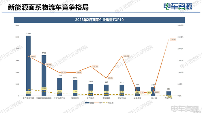 各大车企在新能源面系车市场竞争激烈。2025 年 2 月,上汽通用五菱以 27.6% 的市占率位居榜首,远程新能源商用车、长安凯程汽车紧随其后。不过,各车企同比增速差异明显,东风汽车同比增速高达 238.9%,而华晨鑫源、上汽大通增速较慢。