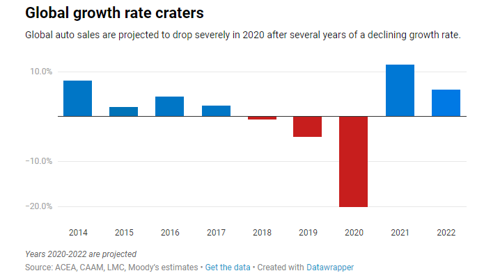 关于2020年全球轻型汽车销量,穆迪预计,同比跌幅至少将达20%,将需要几年时间才能恢复2019年的水平。