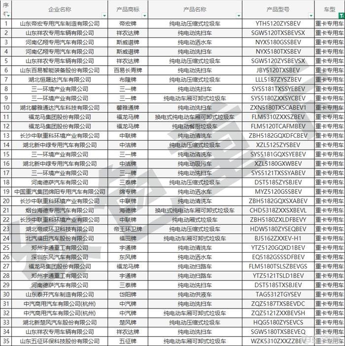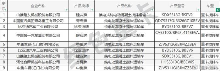110款充电重卡中,比亚迪汽车有9款,徐工汽车、宇通集团、北汽福田各有6款,三一汽车、三一环境产业有限公司等各有4款,一汽解放等各有3款,东风柳汽、北奔重汽等各有2款,庆铃汽车、雷驰新能源等各有1款。